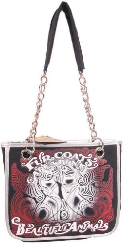 Calico Dragon bags are fashionable and are sure to get your important message across! Additionally, with every bag purchased, Calico Dragon donates a portion of their proceeds to the designated charity that bag represents. Make a BOLD fashion statement while carrying this vegan tote bag! Entitled: Ugly People. The front side depicts two foxes and and reads, Fur Coats are Worn By Beautiful Animals. The back side has a woman stepping in the blood of the animals and reads, And Ugly People. This tote also features a sturdy durable black canvas exterior with printed design, faux-leather piping accents, silver looped chain strap with padded canvas shoulder strap, a snap closure, and a black fabric interior with side zipper pocket and three open pouches. 9.5 in x 11.5 in x 3.5 in.